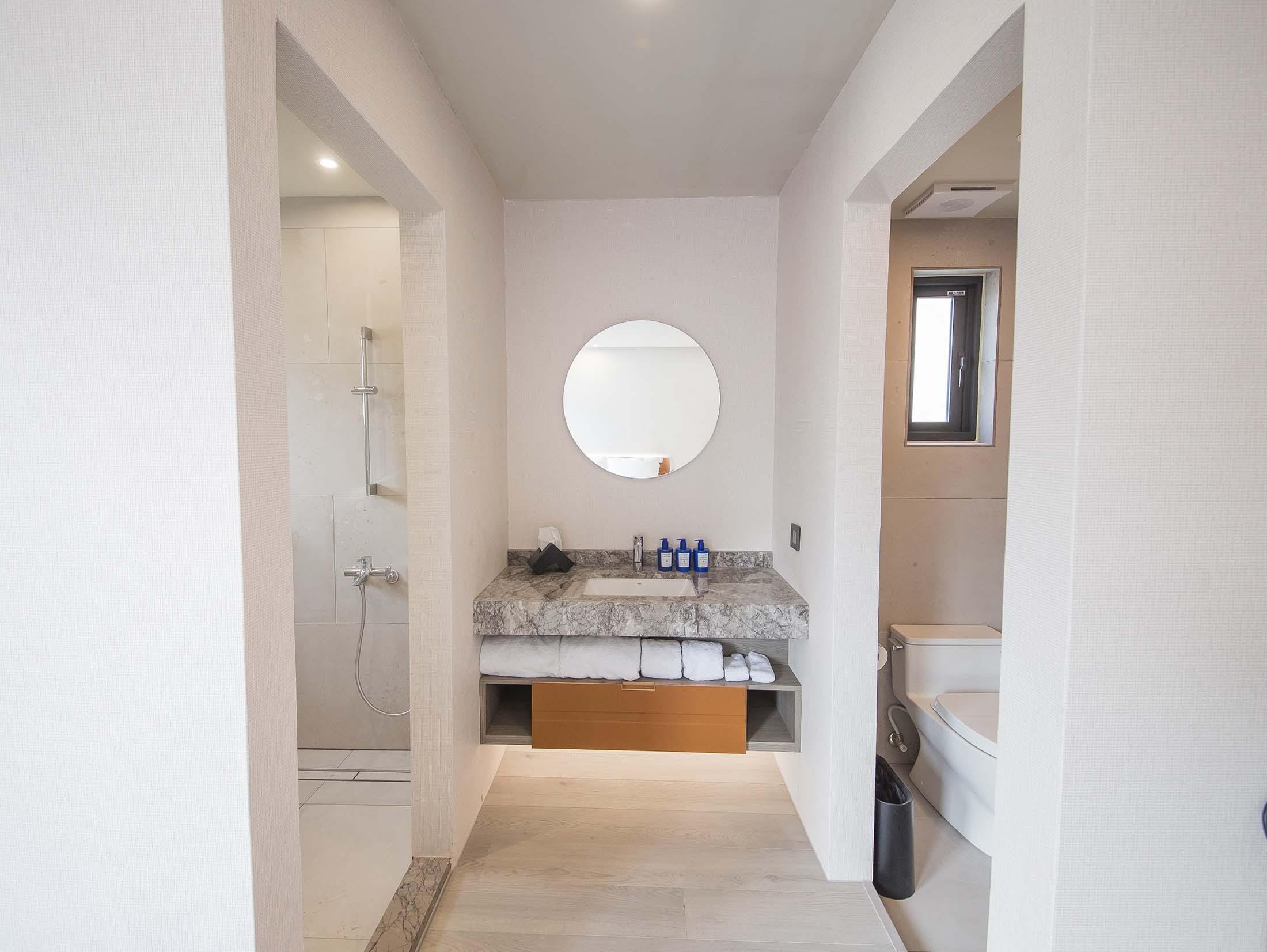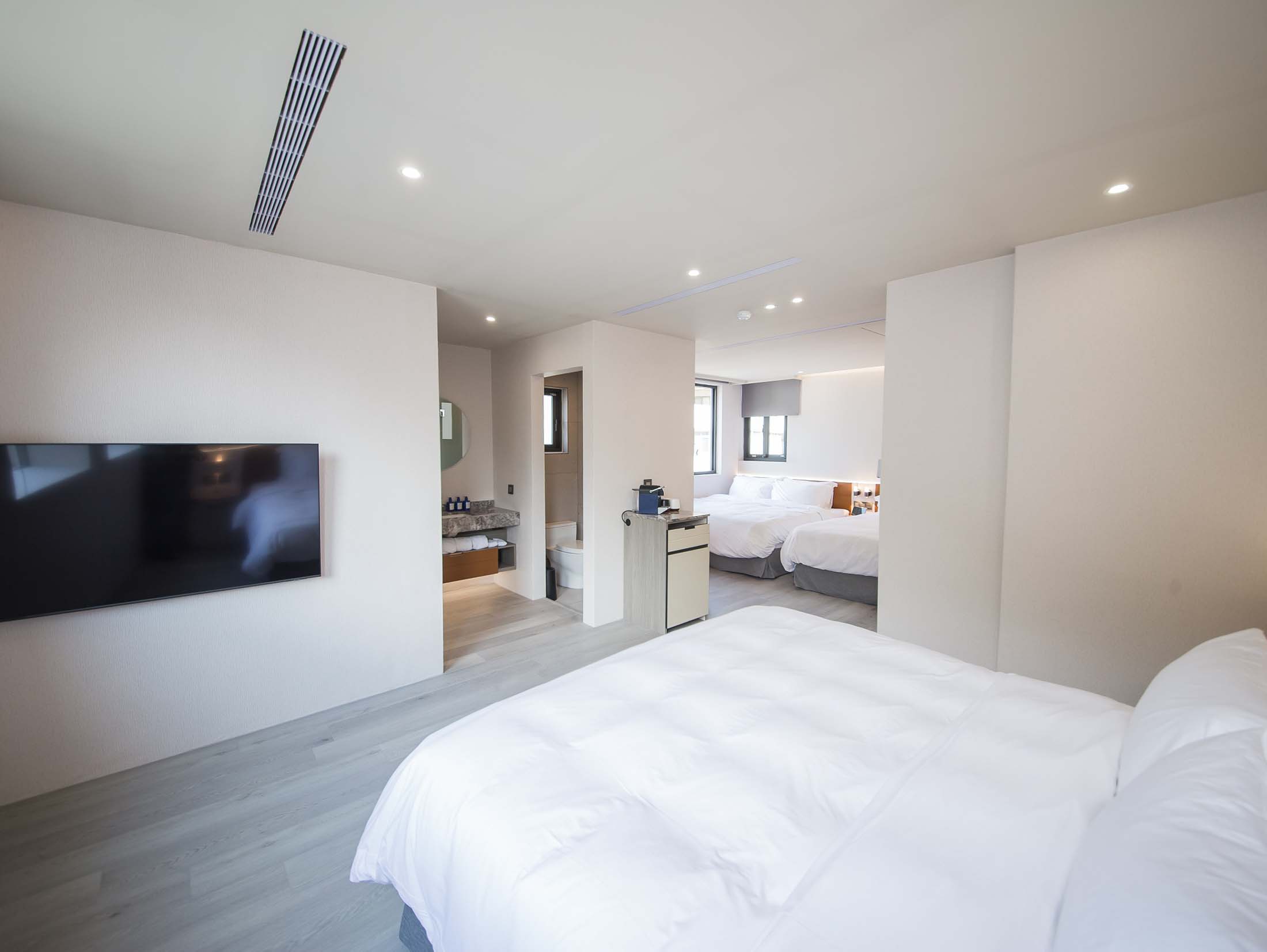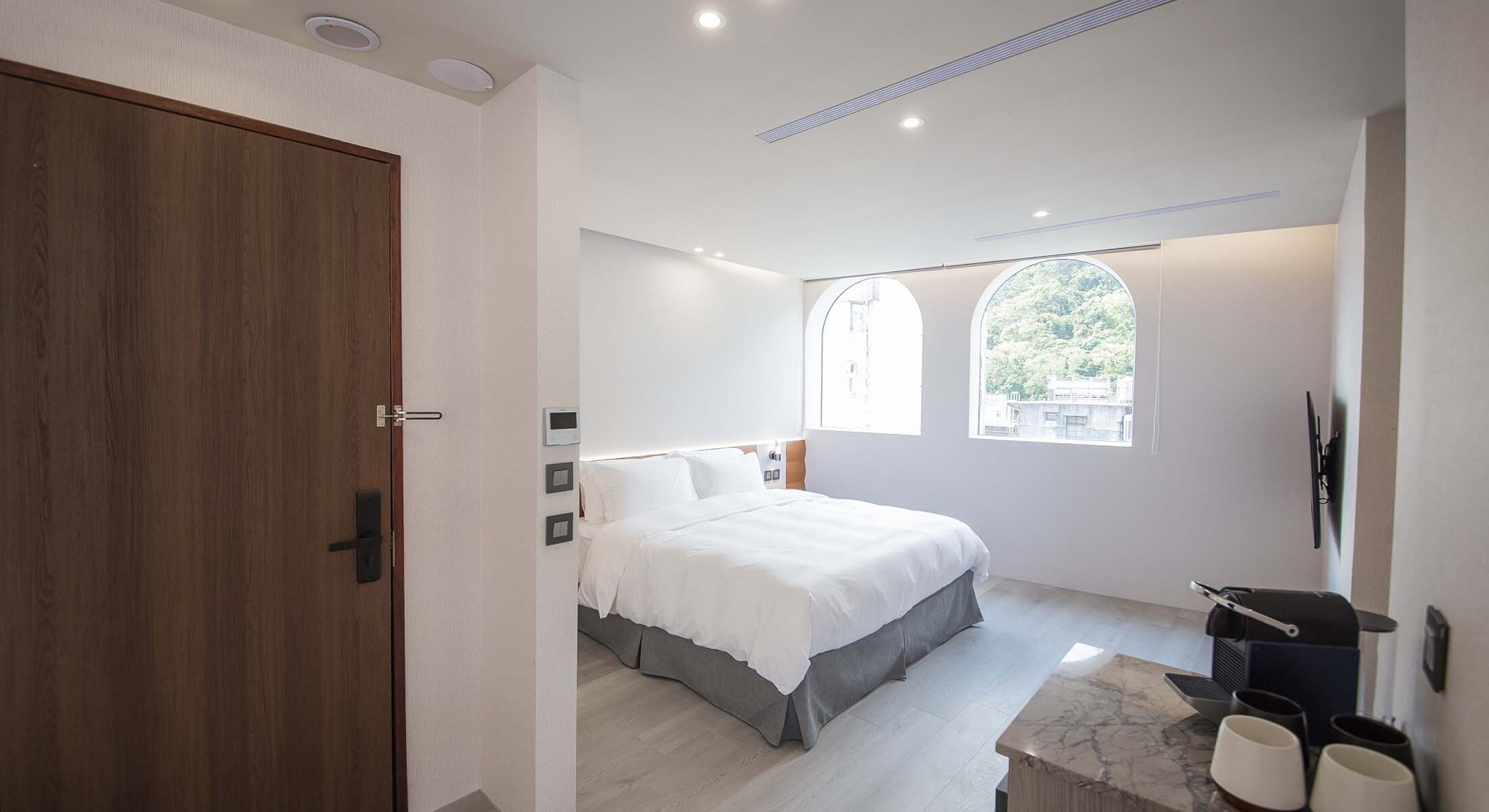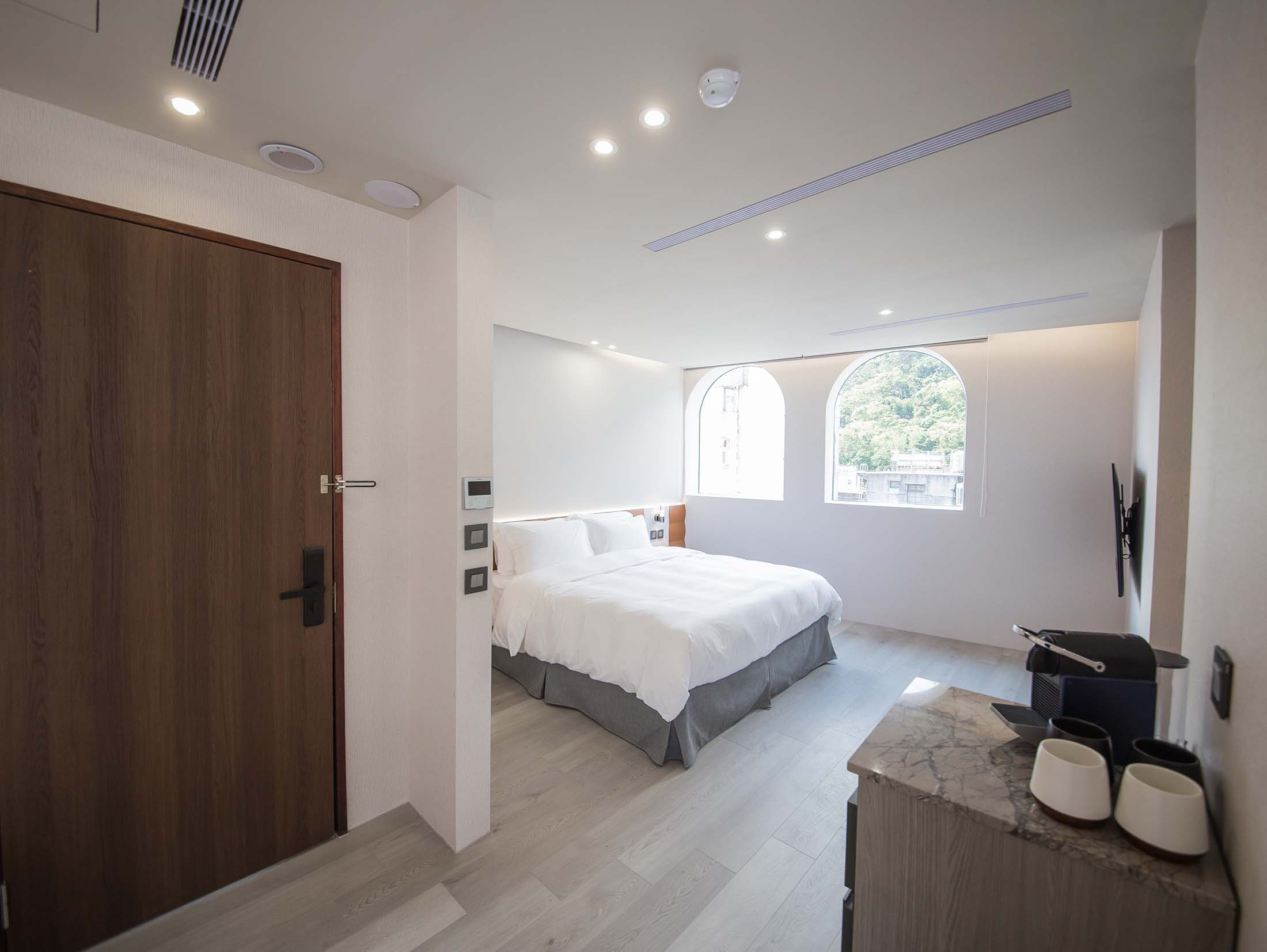 Sunlight streams through wide windows, where hot spring serenity flows with modern elegance.