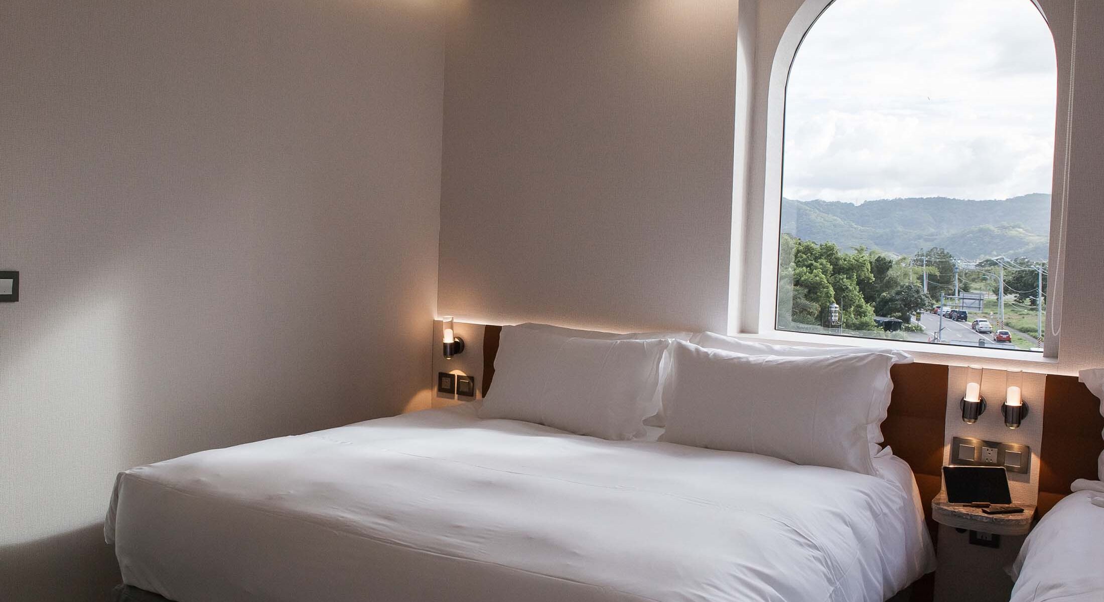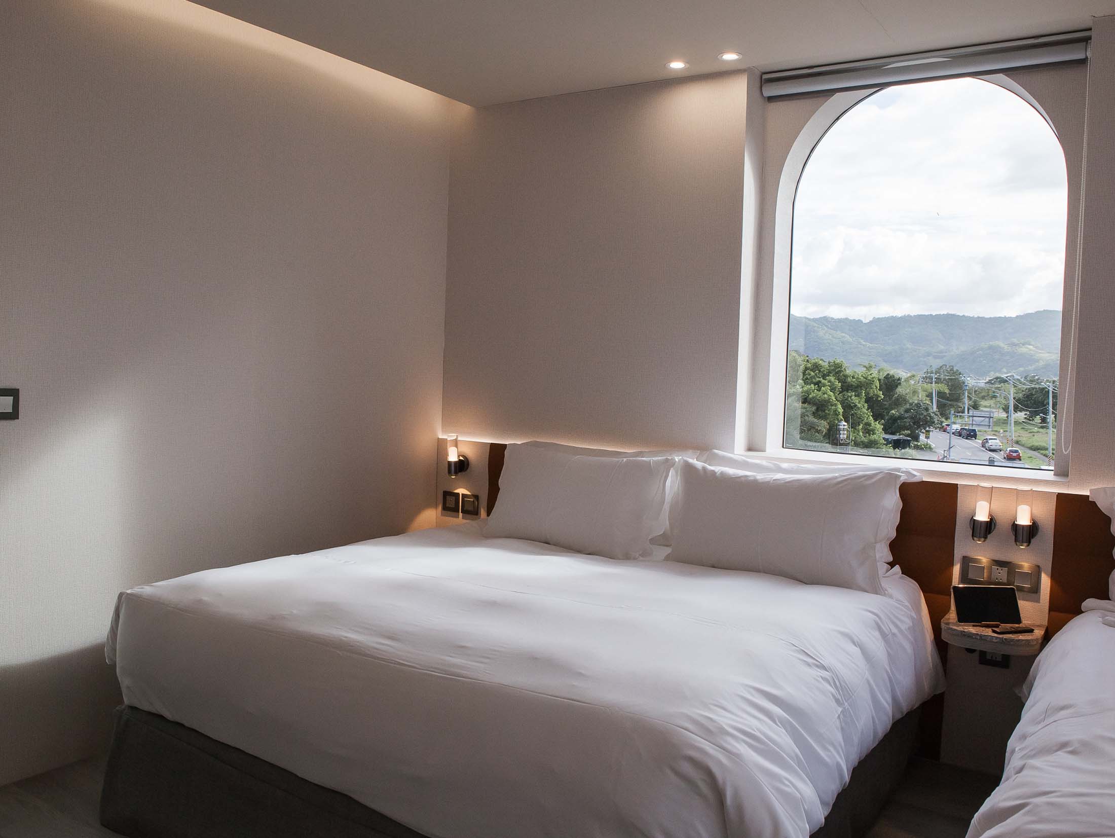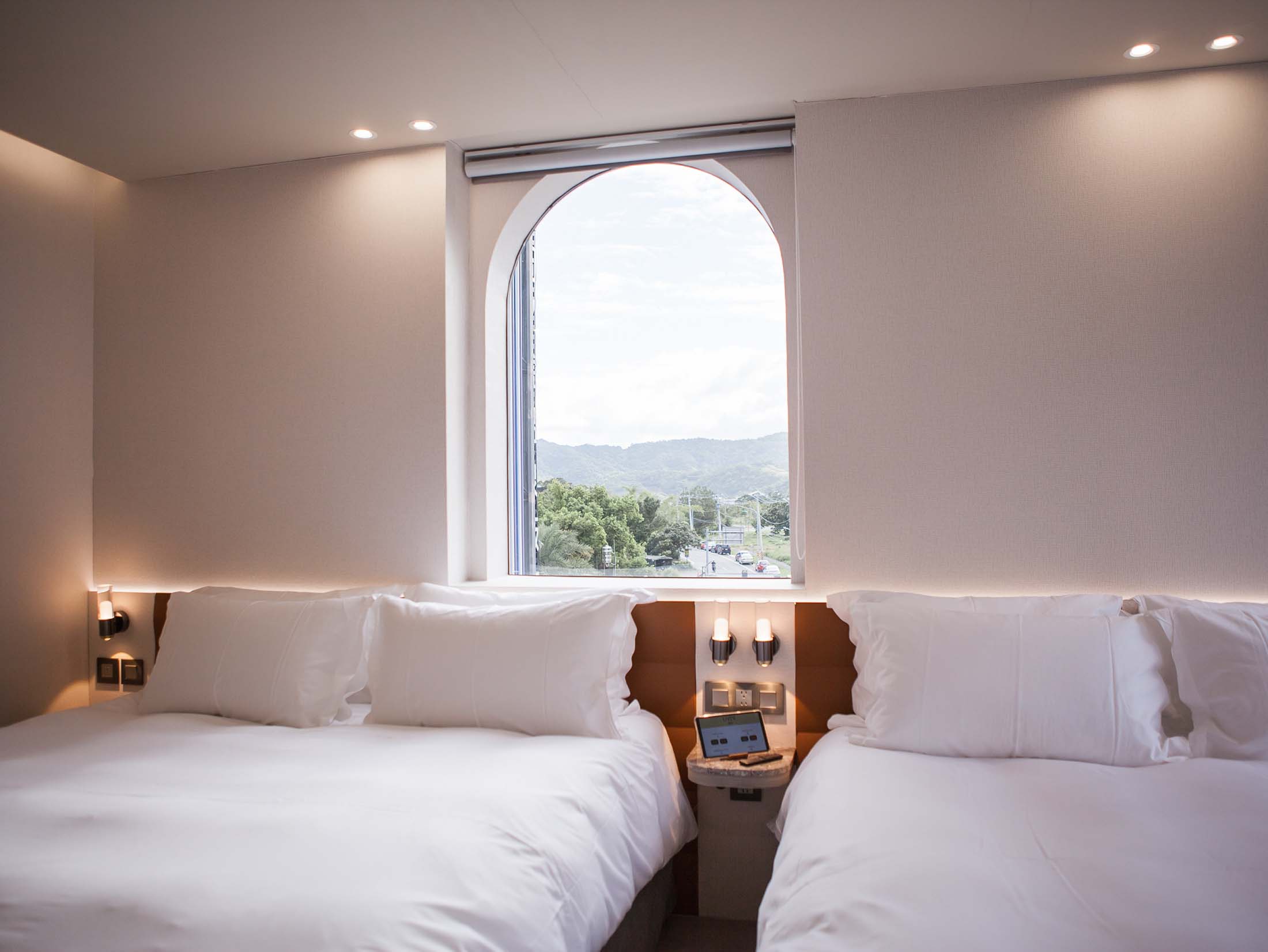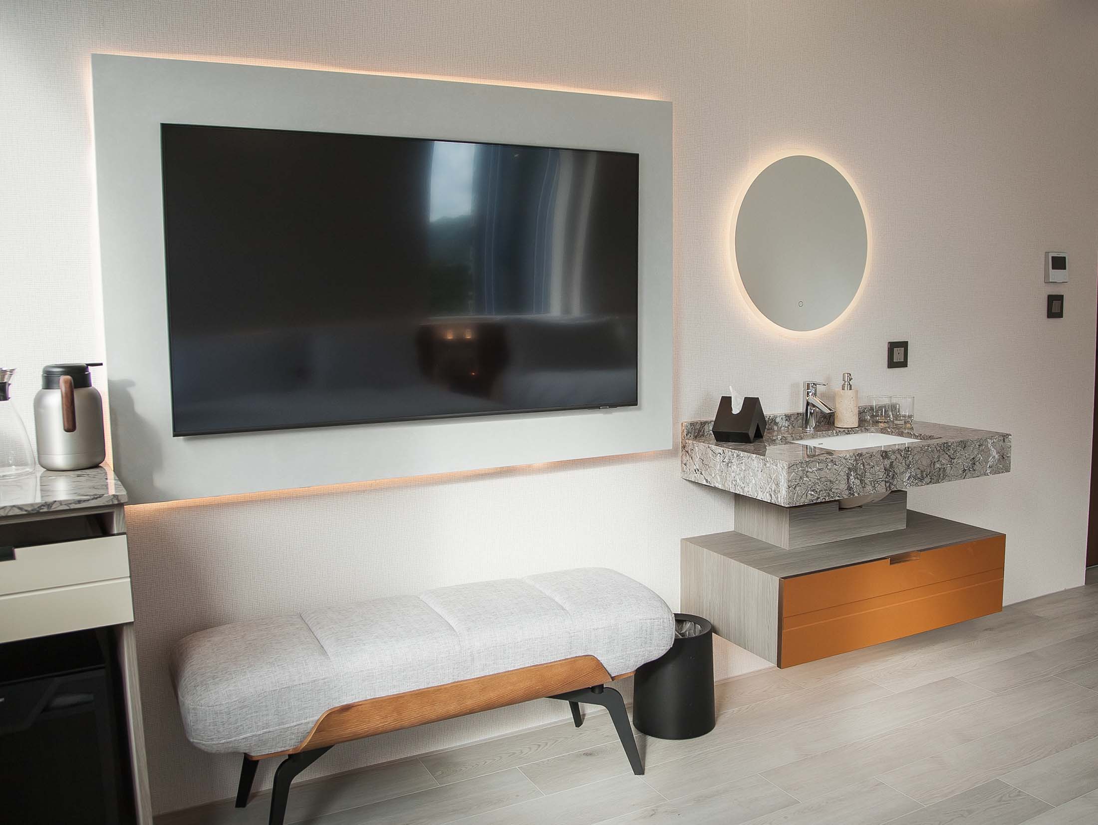 Sunlight streams through wide windows, where hot spring serenity flows with modern elegance.