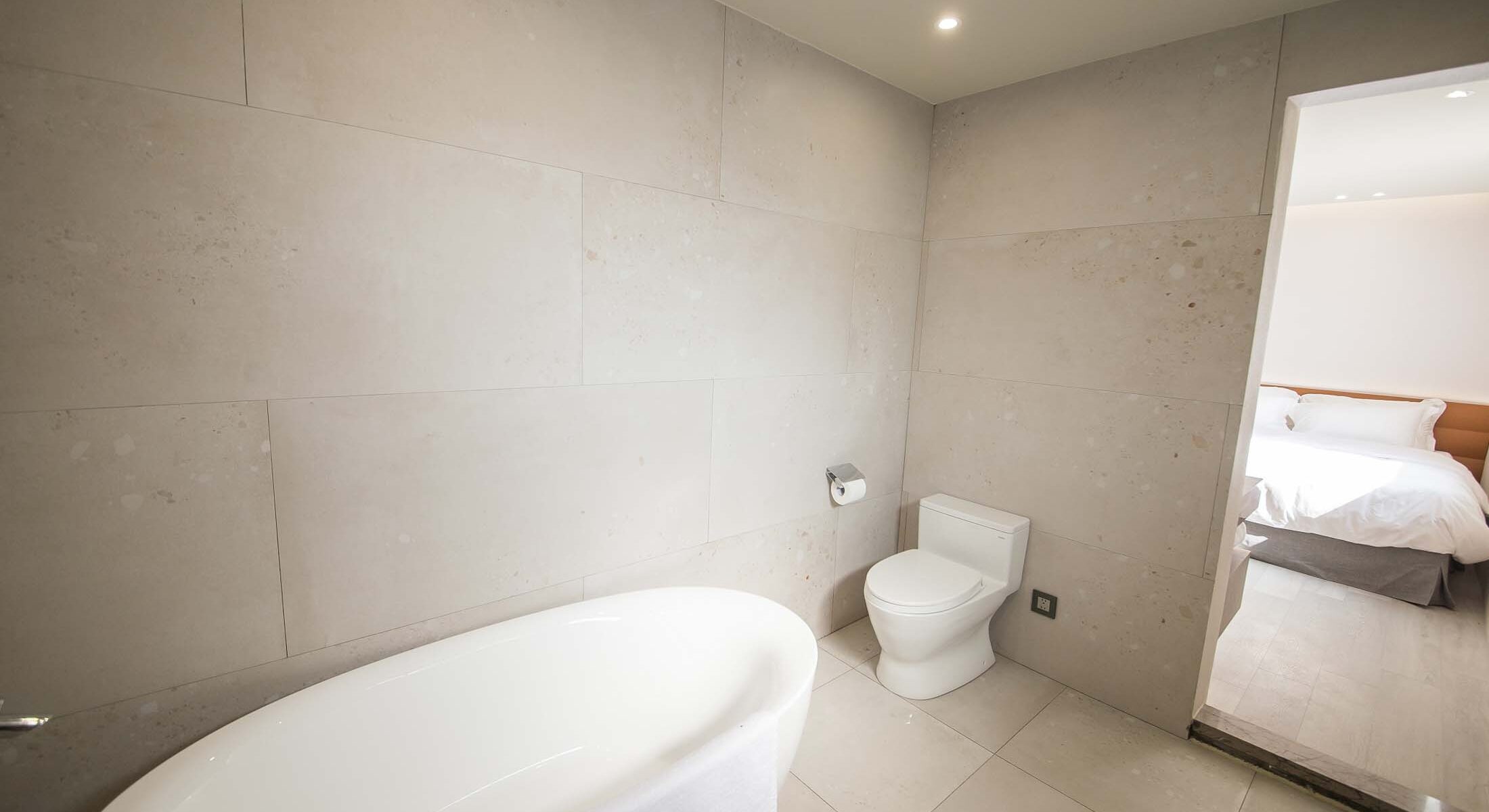 Sunlight streams through wide windows, where hot spring serenity flows with modern elegance.
