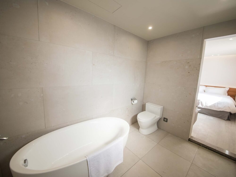寬敞落地窗迎入天光,溫泉與現代優雅在空間中流動。